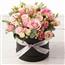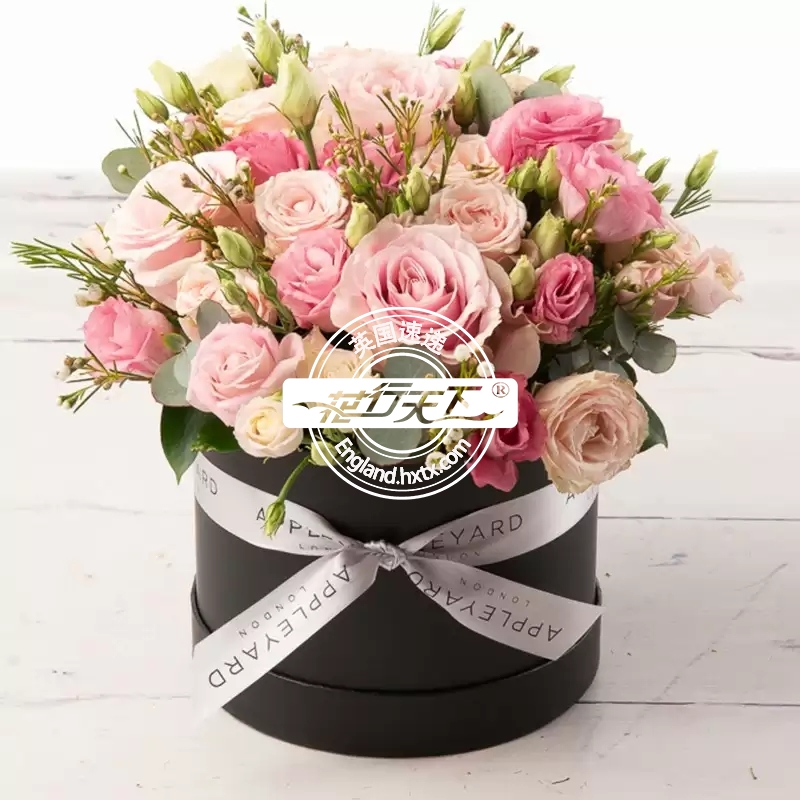 3枝粉玫瑰,2枝腮红粉色喷花玫瑰,2枝白蜡或石膏粉,2枝淡粉色重瓣洋桔梗,黑色盒装.