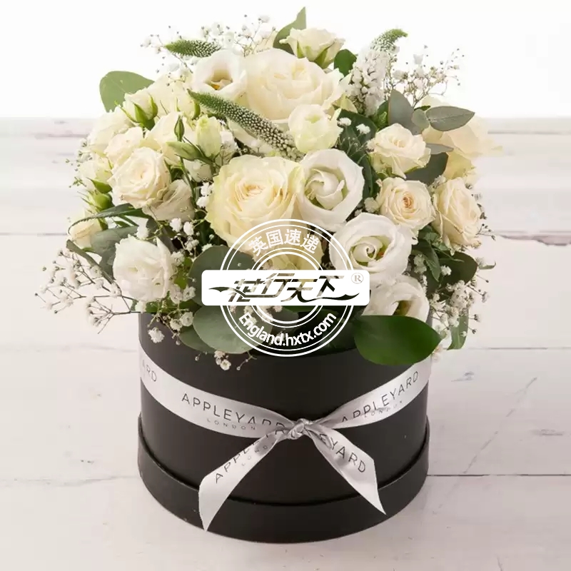 3枝白玫瑰,2枝白色喷花玫瑰,1枝白色蜡花/石膏花,2枝婆婆纳,2枝白色重瓣洋桔梗,黑色盒装.