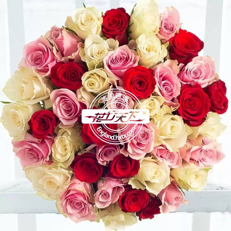 描述: 12朵红玫瑰,14朵白玫瑰,14朵粉玫瑰组成。