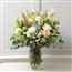 描述: 5朵白色东方百合、5朵白色金鱼草、3株天然蒲苇、3株格莱达荚蒾、3株白色满天星、5朵桃色玫瑰、5朵白色喷雾玫瑰、10株常春藤小径、5朵大型白玫瑰组成。