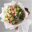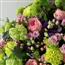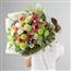 描述: 5枝紫色重瓣洋桔梗、5枝格莱达荚蒾、5枝绿色康乃馨、5枝粉色金丝桃、5枝粉色喷玫瑰、5枝绿铃花、6枝大粉玫瑰组成。