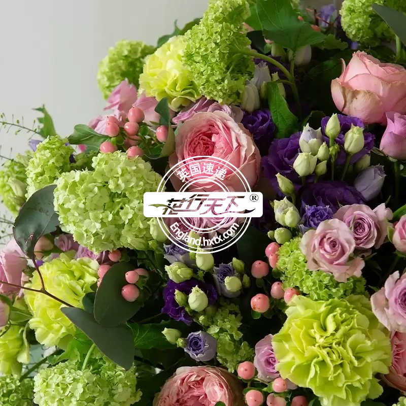 5枝紫色重瓣洋桔梗、5枝格莱达荚蒾、5枝绿色康乃馨、5枝粉色金丝桃、5枝粉色喷玫瑰、5枝绿铃花、6枝大粉玫瑰组成.