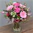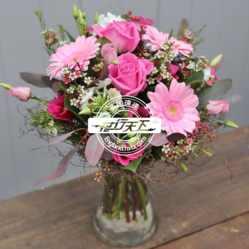 描述: 淡粉色的玫瑰、迷你非洲菊和其他时令花卉组成(装有养护水)。